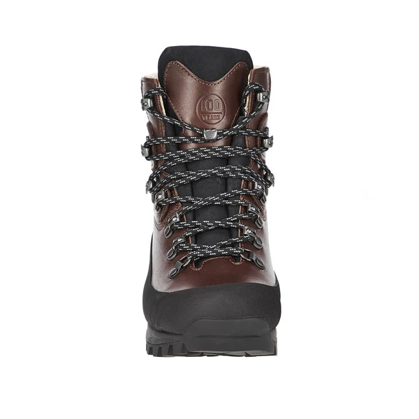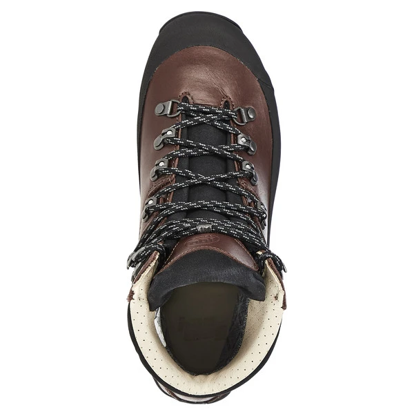 Ist ein Statement, ist aber auch wahr, denn hier wurde wirklich auf jedes noch so kleine Detail geachtet. Als Obermaterial kommt 2,8 mm starkes Narbenleder zum Einsatz. Dieses verleiht dem Stiefel aber nicht nur seine unverkennbare Optik, es macht ihn auch äußerst robust, Felskontakte oder niedriges Gestrüpp sind kein Problem. Im unteren Bereich verfügt der Stiefel über einen weit hochgezogenen umlaufenden Geröllschutzrand samt Fersen- und Zehenschutzkappe. Auch die Schnürhaken wurden noch einmal verbessert, um eine höhere Haltbarkeit gewährleisten zu können.